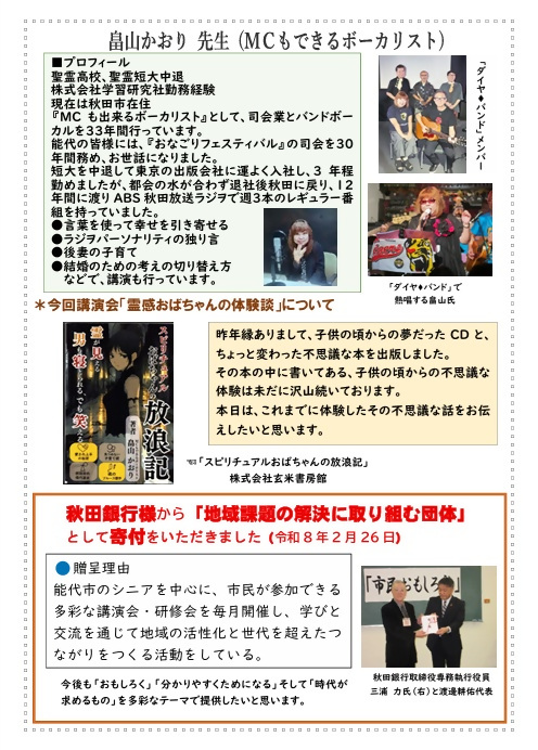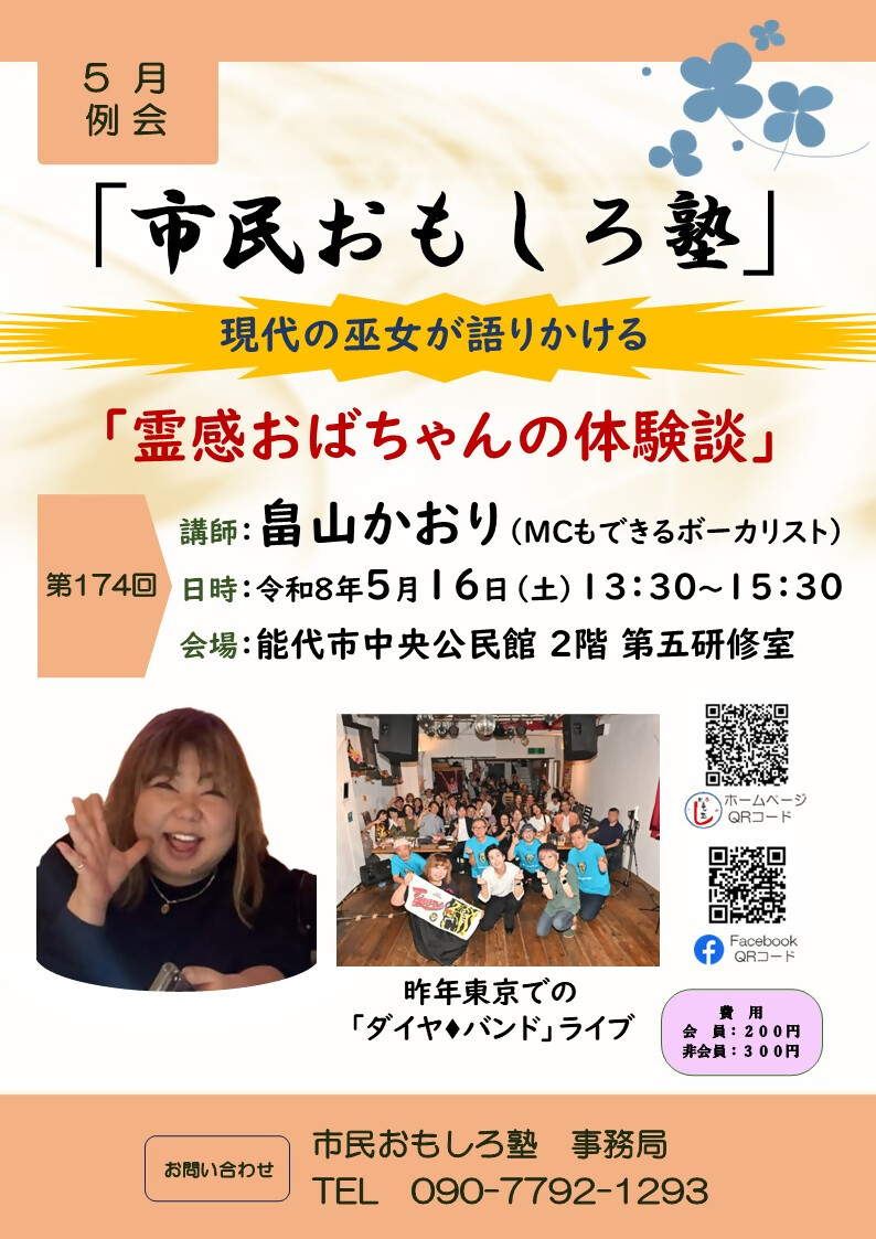 | 名称 | 市民おもしろ塾2026年5月例会 第174回「霊感おばちゃんの体験談」 | ||